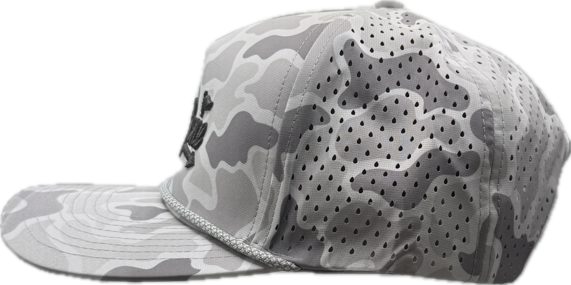 Bold camo, classic rope, and the She Gone attitudeThis bold trucker-style cap features a sleek grey and white camouflage pattern with a crisp black “She Gone” embroidered logo across the front. The structured crown and flat bill give it a modern edge, while the rope accent across the brim adds a classic retro touch. Perfect for making a statement on the course, in the outdoors, or everyday wear.